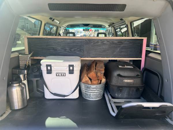 – Table – laminate top, table mounts onto the side wall of the van, and can be removed and repositioned across the two banquettes to form a platform for an air mattress. The bed is a little snug for large humans