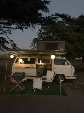 Beautiful 1989 “White Star” Wolfsburg Vanagon. New engine and rebuilt interior/exterior featuring a full-size dining room for four and rooftop tent/deck.