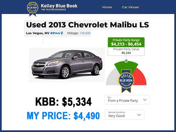 The Kelley Blue Book private party value is $5,334, but this 2013 Chevy Malibu LS is available for the attractive price of $4,490. Please note that offers are not being considered at this time, simplifying the buying process. Interested buyers can view the car in the Summerlin area. For inquiries, you can reach out via the following phone numbers: (702) 485-8212 or (702) 544-9591.